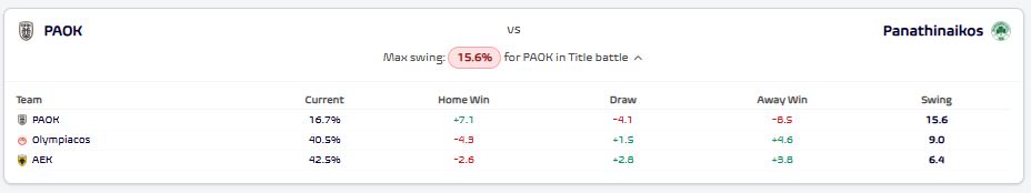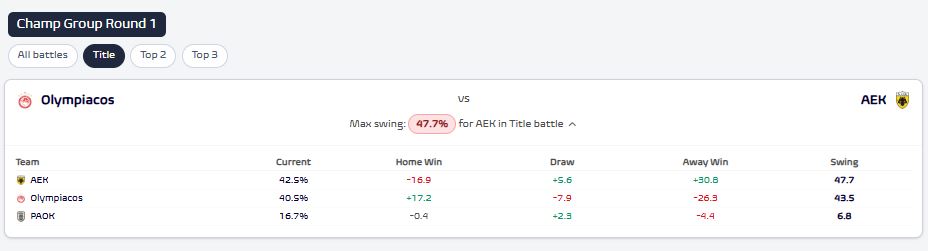 Σε περίπτωση νίκης του Ολυμπιακού κόντρα στην ΑΕΚ, οι Πειραιώτες θα αυξήσουν τις πιθανότητές τους κατά 17,2%, η Ένωση θα δει μείωση 16,9% και ο ΠΑΟΚ 0,4. Σε τυχόν ισοπαλία, οι πιθανότητες των κιτρινόμαυρων θα ανέβουν κατά 5,6%, του Δικεφάλου κατά 2,3%, ενώ οι Ερυθρόλευκοι θα δουν τις δικές τος να μειώνονται κατά 7,9%. Τέλος, αν η ΑΕΚ πάρει διπλό στο Φάληρο, τότε θα εκτοξεύσει τις πιθανότητές της +30,8%. Ολυμπιακός και ΠΑΟΚ θα δουν μείωση κατά 26,3% και 4,4%, αντίστοιχα, σύμφωνα με τα δεδομένα του Football Meets Data.