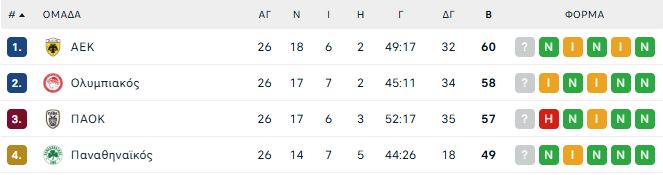 Αυτή τη στιγμή, η ΑΕΚ είναι πρώτη με 60 βαθμούς, ο Ολυμπιακός ακολουθεί με 58, ο ΠΑΟΚ με 57 και ο Παναθηναϊκός πιο πίσω με 49. Είναι σαφές πως το ματς στο Φάληρο θα αλλάξει την εικόνα στην κορυφή της βαθμολογία και to10.gr με τη βοήθεια των δεδομένων του Football Meets Data, αναλύει όλα τα αποτελέσματα.