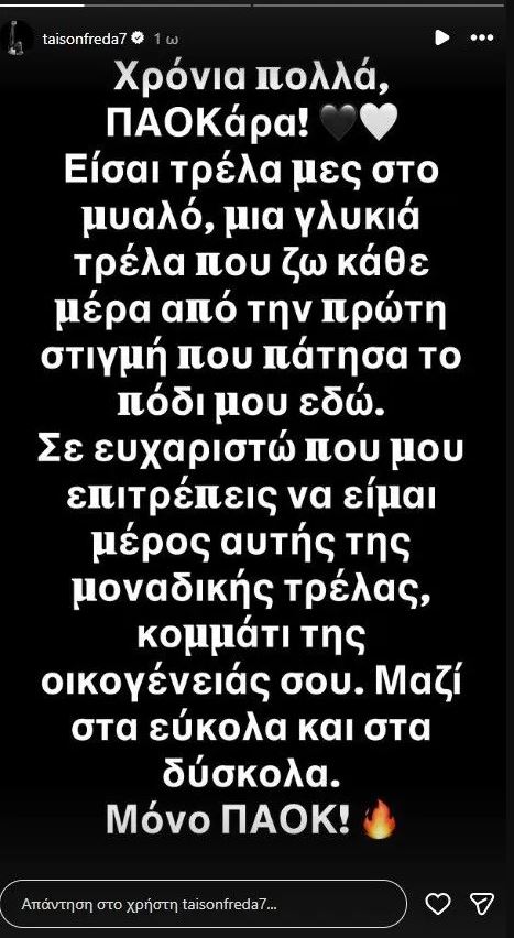 Ο Τάισον, ένας από τους κορυφαίους ποδοσφαιριστές της σύγχρονης ιστορίας του ΠΑΟΚ, ευχήθηκε κι αυτός με ένα story στο Instagram γραμμένο μάλιστα στα ελληνικά, αποδεικνύοντας για μια ακόμη φορά πόσο έχει ταυτιστεί με τη χώρα μας μέσω του Δικεφάλου.