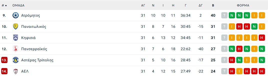 Στο Περιστέρι, ο Ατρόμητος πήρε νίκη με 2-1 επί του Αστέρα Τρίπολης και κλείδωσε την άτυπη πρώτη θέση. Οι γηπεδούχοι έφτασαν τους 40 πόντους, ενώ οι Αρκάδες παραμένουν σε δύσκολη θέση μένοντας στους 25 πόντους και την προτελευταία θέση.