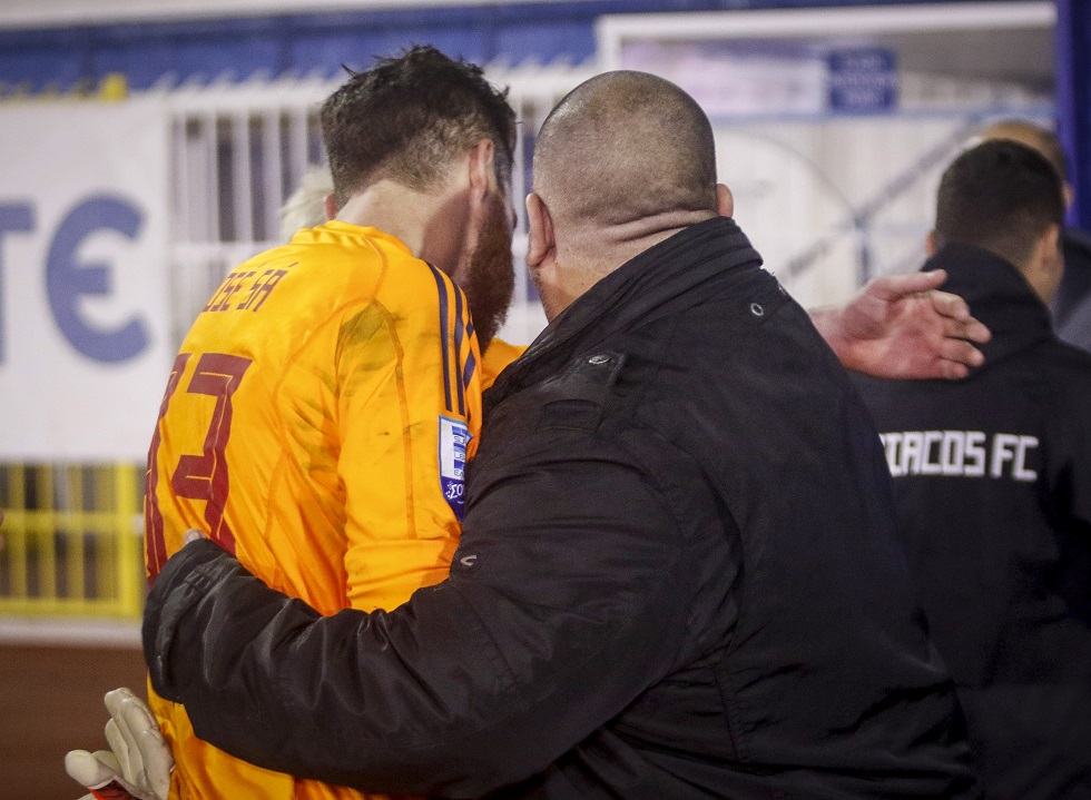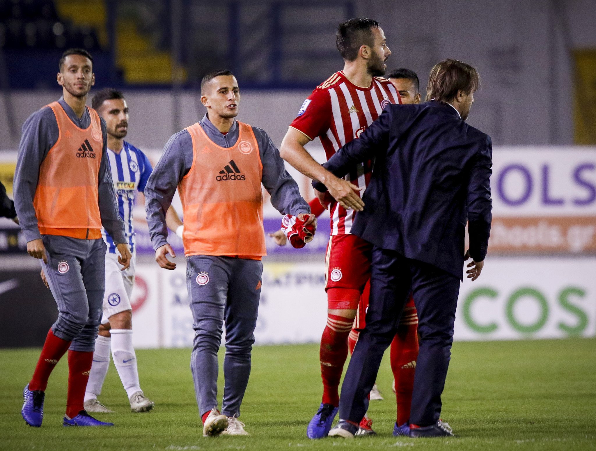 Μετά τη λήξη του παιχνιδιού στο Περιστέρι ο Κώστας Καραπαπάς μάζεψε τους παίκτες στον αγωνιστικό χώρο και τους ζήτησε να φωνάξουν «Ολυμπιακός» - Τρελοί πανηγυρισμοί για την ανατροπή-νίκη απέναντι στον Ατρόμητο.