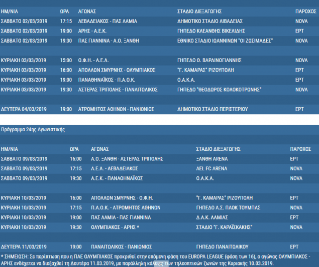 Αν οι ερυθρόλευκοι συνεχίσουν στη δεύτερη τη τάξει ευρωπαϊκή διοργάνωση τότε το παιχνίδι τους με τον Άρη θα μετακινηθεί τη Δευτέρα 11/3 και το ντέρμπι ανάμεσα σε Παναθηναϊκό και ΑΕΚ που διεξάγεται την ίδια αγωνιστική και πιο συγκεκριμένα το Σάββατο 9/3 θα μετακινηθεί για την Κυριακή 10/3.
