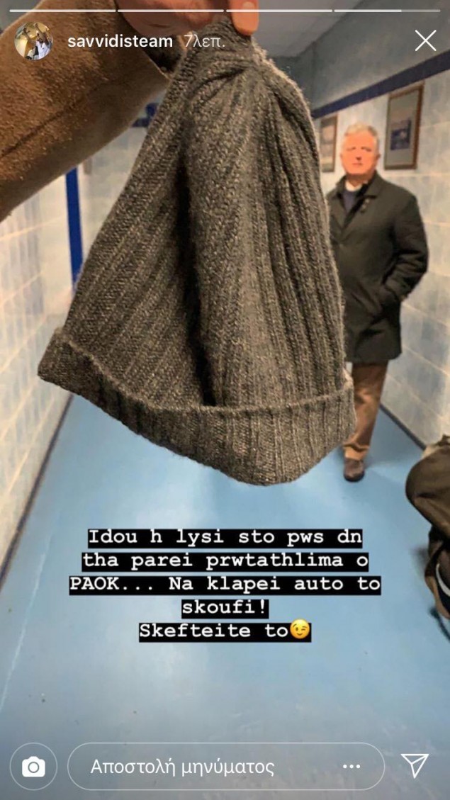 Το μέλος του ΔΣ των Ασπρόμαυρων «ανέβασε» μια φωτογραφία με το γνωστό πλέον γούρικο σκουφί του προπονητή της ομάδας, σημειώνοντας: «Ιδού η λύση στο πως δεν θα πάρει το πρωτάθλημα ο ΠΑΟΚ… Να κλαπεί αυτό το σκουφί… Σκεφτείτε το».