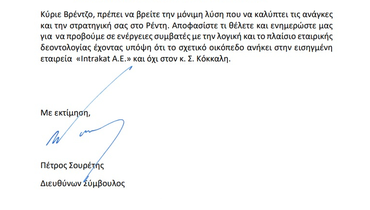 Κύριε Βρέντζο, πρέπει να βρείτε την μόνιμη λύση που να καλύπτει τις ανάγκες και την στρατηγική σας στο Ρέντη. Αποφασίστε τι θέλετε και ενημερώστε μας για να προβούμε σε ενέργειες συμβατές με την λογική και το πλαίσιο εταιρικής δεοντολογίας έχοντας υπόψη ότι το σχετικό οικόπεδο ανήκει στην εισηγμένη εταιρεία «Intrakat Α.Ε.» και όχι στον κ. Σ. Κόκκαλη.