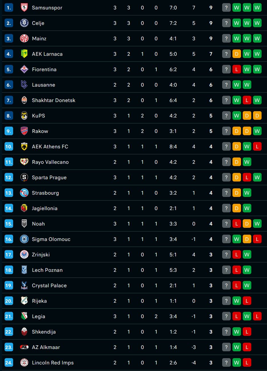 Η Σαμσουνσπόρ καθάρισε εύκολα (3-0) τους Μαλτέζους της Χάμρουν, η Τσέλιε νίκησε (2-1) τη Λέγκια, ενώ και η Μάιντς πήρε στο 95' το ντέρμπι κορυφής με τη Φιορεντίνα (2-1). με τις τρεις ομάδες να συνεχίζουν με το 3/3 – Δείτε τη βαθμολογία της League Phase του Conference League.