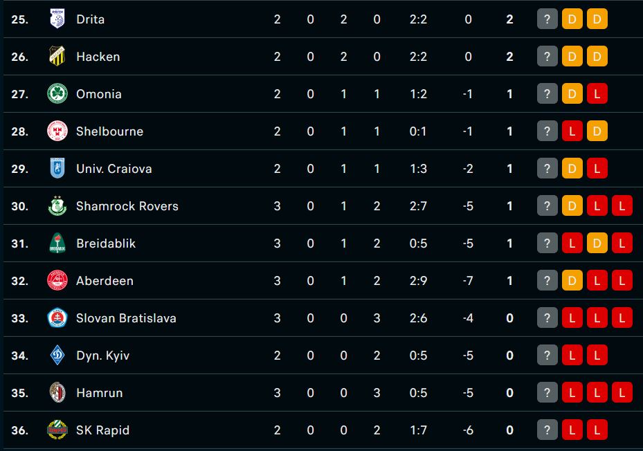Η Φιορεντίνα έπεσε πια στην 5η θέση, ενώ μια θέση πιο πάνω βρίσκεται πλέον η ΑΕΚ Λάρνακας η οποία δεν μπόρεσε να νικήσει στην έδρα της (0-0) την Αμπερντίν. Ίδιο αποτέλεσμα, ισοπαλία χωρίς γκολ είχε και το Σπάρτα Πράγας – Ράκοβ (0-0), ενώ η άλλη ισοπαλία των αγώνων των 20:00 «ανήκει» φυσικά στην ΑΕΚ, που έμεινε στο 1-1 με τη Σάμροκ Ρόβερς. Από κει και πέρα, η Σαχτάρ νίκησε εύκολα 2-0 την ισλανδική Μπρέινταμπλικ, η Κουόπιο επικράτησε 3-1 της Σλόβαν και η Σίγκμα Όλομουτς πήρε το «διπλό» (1-2) στην έδρα της Νόα.