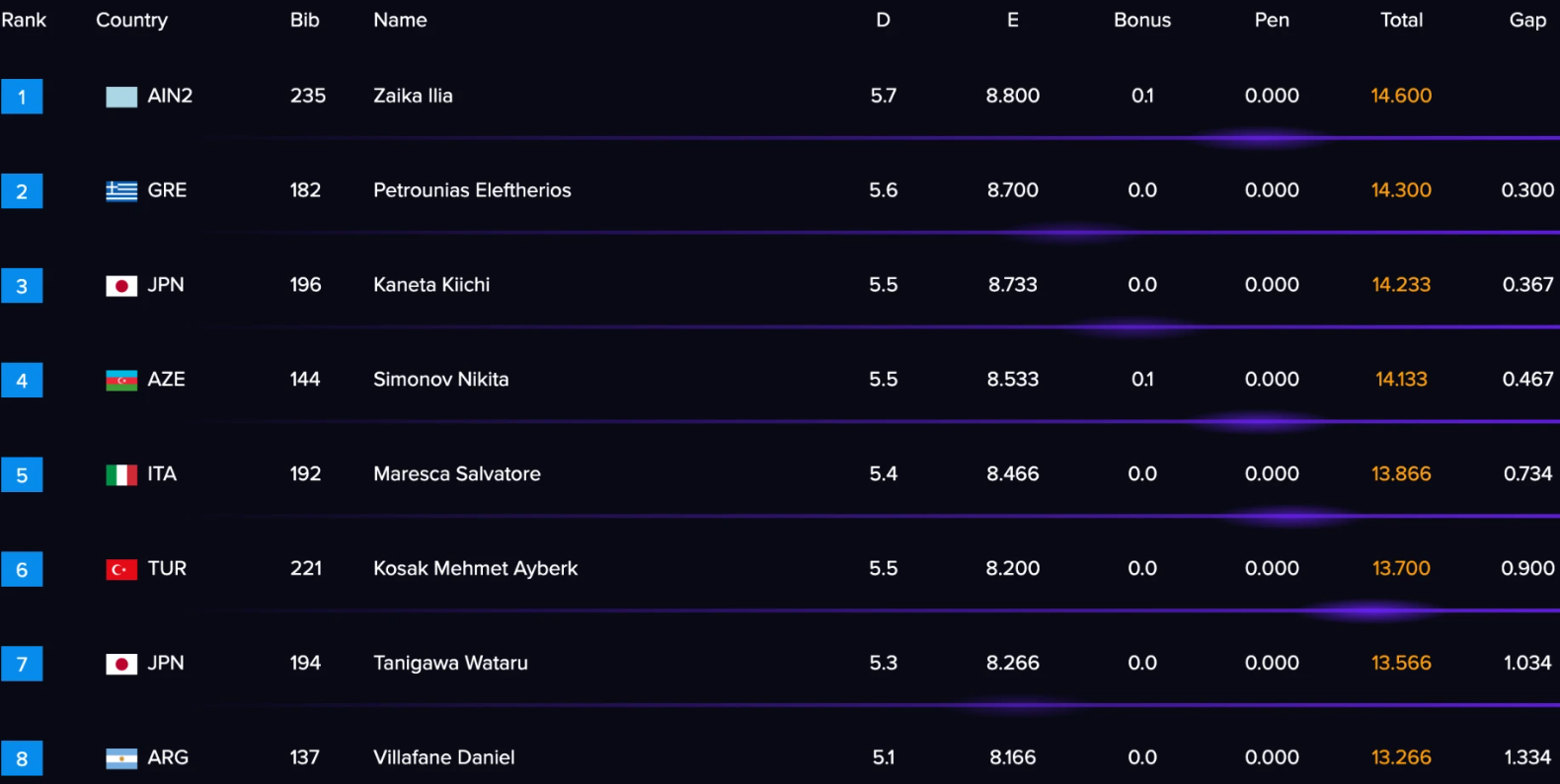 Ο 24χρονος Ιάπωνας Κιίτσι Κανέτα πήρε την τρίτη θέση και το χάλκινο μετάλλιο με βαθμολογία 14.233β (5.5, 8.733β), νικώντας στις λεπτομέρειες τον Αζέρο Νικίτα Σιμόνοφ, που είχε τον ίδιο βαθμό δυσκολίας αλλά με ελαφρώς χειρότερη εκτέλεση έμεινε στους 14.133β (5.5, 8.533β).