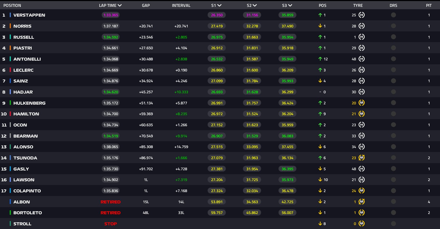 Ο Νόρις χρειάστηκε λοιπόν να μονομαχήσει στην πίστα με τον Ράσελ για τη 2η θέση, ενώ ο Πιάστρι πέρασε με undercut του Σαρλ Λεκλέρ και Κάρλος Σάινθ για να τερματίσει στην 4η θέση.