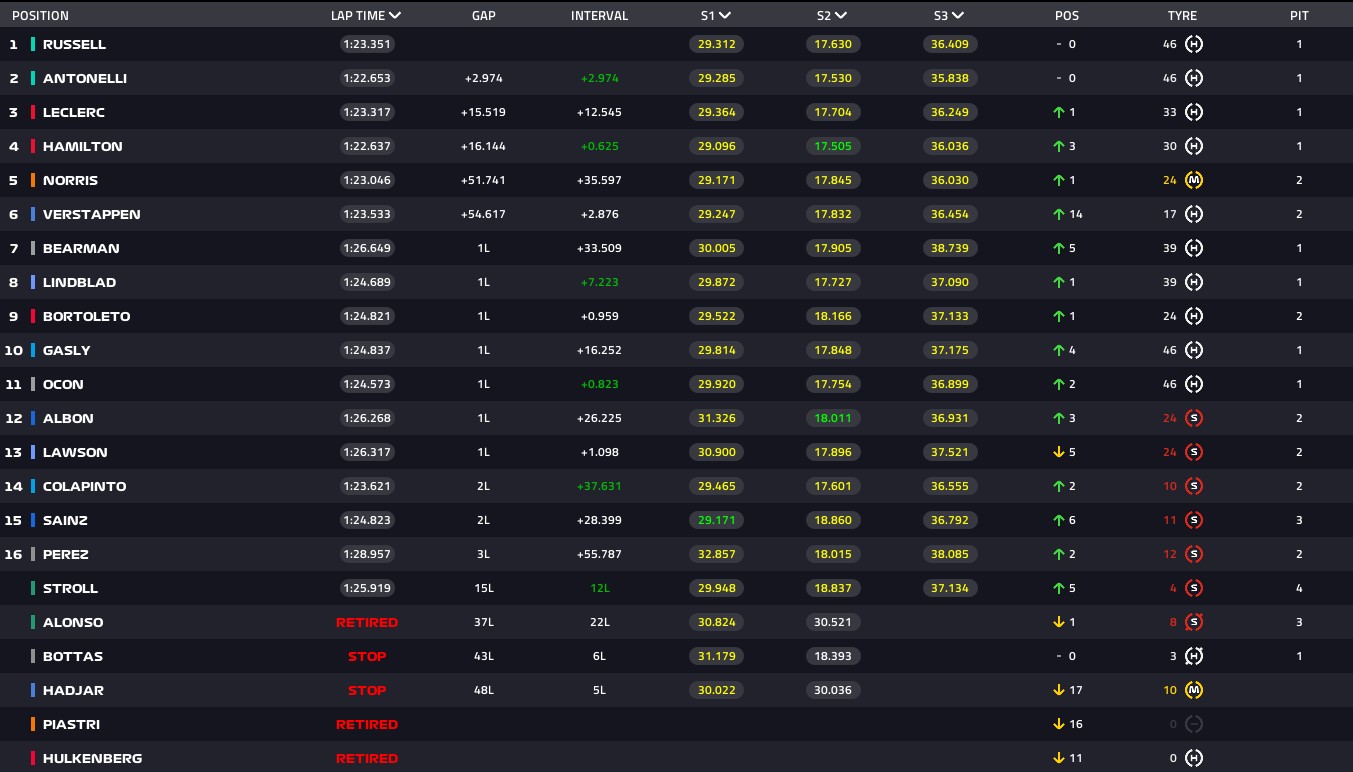 Εκτός από τους Πιάστρι, Χούλκενμπεργκ και Χατζάρ, εγκατέλειψαν οι δύο Aston Martin (όπως ξέραμε και περιμέναμε) αλλά και ο Βάλτερι Μπότας, στον παρθενικό αγώνα της Cadillac στη Formula 1.