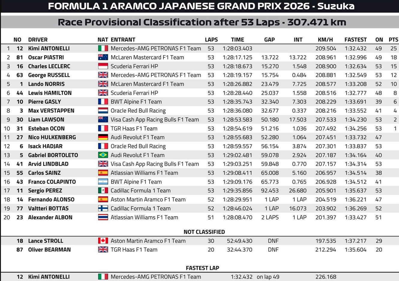 Ο Αντρέα Κίμι Αντονέλι πέτυχε τη δεύτερη διαδοχική του νίκη στη Formula 1 κατακτώντας το Grand Prix Ιαπωνίας - Δεύτερος ο Πιάστρι, τρίτος ο Λεκλέρ