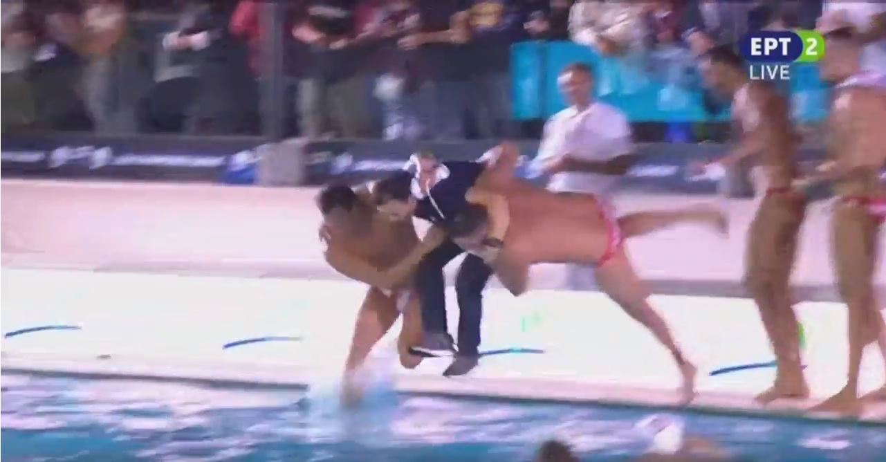 Ο τεχνικός της ομάδας Θοδωρής Βλάχος αφιέρωσε τη νίκη στον κόσμο του Ολυμπιακού που βρισκόταν στο κολυμβητήριο και στη συνέχει οι παίκτες του έριξαν στην πισίνα για να γιορτάσουν όλοι μαζί!