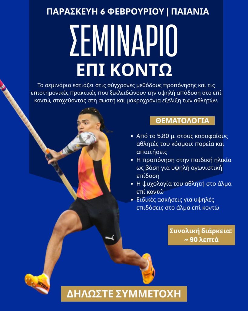 Σε συνεργασία με την επιστημονική ομάδα του ΣΕΓΑΣ, το πρόγραμμα, διάρκειας περίπου 90 λεπτών, σχεδιάστηκε για προπονητές και φοιτητές ΤΕΦΑΑ και εστιάζει στη διαδρομή από τις βάσεις της παιδικής ηλικίας ως το φράγμα των 5.80μ και μέχρι την παγκόσμια καταξίωση. Μέσα από στοχευμένες εισηγήσεις, θα αναλυθούν οι σύγχρονες προπονητικές προσεγγίσεις, οι ειδικές ασκήσεις υψηλών επιδόσεων, αλλά και ο κρίσιμος παράγοντας της ψυχολογίας που απαιτεί το συγκεκριμένο αγώνισμα.