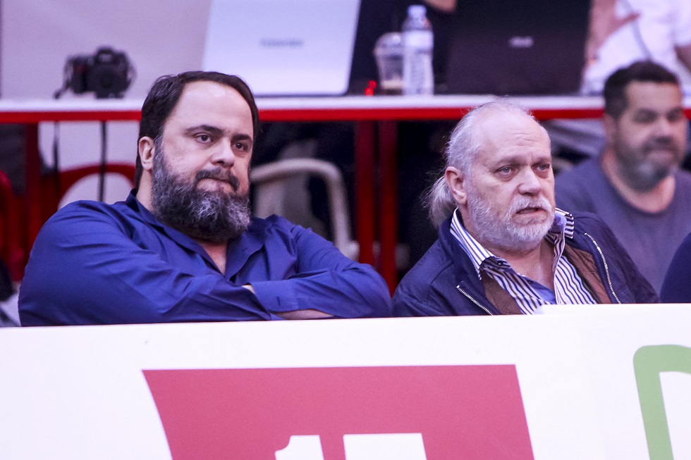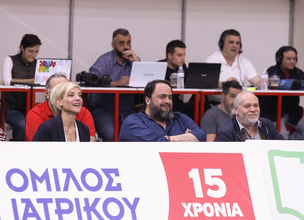 Ο Βαγγέλης Μαρινάκης έχει πάρει τη θέση του, δίπλα στον Μιχάλη Κουντούρη και την Χριστίνα Τσιλιγκίρη και είναι έτοιμος να πανηγυρίσει μαζί με τον κόσμο της ομάδας ακόμα μία κούπα.