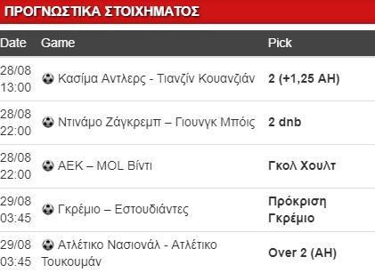 Η δε αργεντίνικη Ατλέτικο Τουκουμάν είχε επιβληθεί με 2-0 της κολομβιανής Ατλέτικο Νασιονάλ, απόψε διεξάγεται η ρεβάνς στο Μεντεγίν με τον άσο σε ανάλογη τιμή (1.47). Ερώτημα αν οι Αργεντίνοι αντέξουν στο υψόμετρο του Μεντεγίν (1.500 μ. πάντως, μόνο), επιλογή το ασιατικό over 2 στο 1.65 με επιστροφή πονταρίσματος σε ακριβώς δύο γκολ.