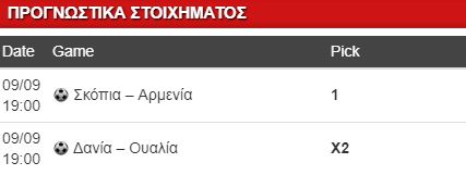 Δανία και Ουαλία παίζουν στο Ααρχους. Οι Ουαλοί ξεκίνησαν με το εύκολο 4-1 επί της Ιρλανδίας, βρήκαν και τα έκαναν αφού οι αντίπαλοί τους είχαν πολλές ελλείψεις, ωστόσο δεν παραβλέπεται η καλή τους απόδοση. Συν ότι, έστω κι αν εντέλει το θέμα με τους Δανούς λύθηκε μόλις προχθές, και η προετοιμασία των διεθνών έγινε με προβλήματα, και ούτως ή άλλως υπάρχουν ελλείψεις, ειδικά μπροστά (Μπέντνερ, Γιόργκενσεν, Ντόλμπεργκ), συν τον μέσο Βας και τον στόπερ Μπιέλαντ ενώ αποσύρθηκαν μετά το Μουντιάλ οι μέσοι Κβιστ και Κρον-Ντέλι. Στο 1.75 η ουαλική διπλή ευκαιρία, στο 2.65 το draw no bet της.