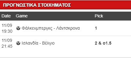 Τι άλλο παίζω, λοιπόν; Οπωσδήποτε τον άσο του «τρένου» (για την άνοδο) Φάλκενμπεργκς επί της (εκ των ουραγών) Λάντσκρονα και θα τον συνδυάσω με το Βέλγιο, το οποίο φαντάζει «βουνό» για τους «μπακαλιάρους»! Οχι τόσο επειδή οι «Τεν Τεν» ρίξανε τέσσερα στο χαλαρό στη Σκωτία, την ώρα που οι Ισλανδοί έτρωγαν έξι(!) από τους Ελβετούς, αλλά διότι εδώ κι ένα χρόνο οι γηπεδούχοι (από την ώρα που εξασφάλισαν το Μουντιάλ), δυσλειτουργούν…