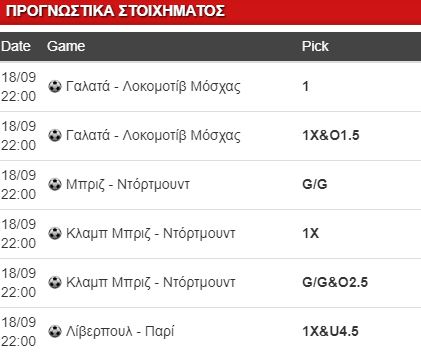 Βασική μου πρόταση είναι το παιχνίδι της Κλαμπ Μπριζ κόντρα στην Ντόρτμουντ. Οι Γερμανοί με το Φαβρ στον πάγκο τους να κάνει εξαιρετική δουλειά ταξιδεύουν στο Βέλγιο με στόχο το τρίποντο, αυτό που δεν κατάφεραν να πάρουν πέρσι. Αήττητη η Ντόρτμουντ φέτος έως τώρα, που όμως σήμερα θα έχει απουσίες, τόσο στα μετόπισθεν όσο και μπροστά. Από την άλλη οι Βέλγοι σε 8 φετινά τους διατηρούν το αήττητο, βρίσκονται σε εξαιρετική κατάσταση, σκοράροντας εύκολα, μετρώντας 6 Over 2.5 και 4 συνεχόμενα G/G. Παραμένει στην κορυφή της βαθμολογίας και σήμερα εντός έδρας μπορεί να πάρει βαθμούς. Το 1Χ στο 2.05, το G/G στο 1.60 και το G/G&O2.5 στο 1.95.