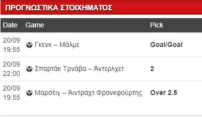Χαιρετώ την παρέα του bet-hoven.net. Δυστυχώς δε βγήκαν οι επιλογές για το Τσάμπιονς Λιγκ χθες, η Σαχτάρ την «πάτησε» από την πολύ καλά στημένη και «ψυχωμένη» Χόφενχαϊμ (2-2), ενώ στο «Μπερναμπέου» η Ρεάλ είχε εύκολο έργο απέναντι στη Ρόμα (3-0), που δημιούργησε ευκαιρίες, αλλά ο σταθερότατος Νάβας δεν επέτρεψε την παραβίαση της εστίας του. Στις σημερινές επιλογές, με περισσότερη προσοχή, δεσπόζουν οι Βέλγικες ομάδες.