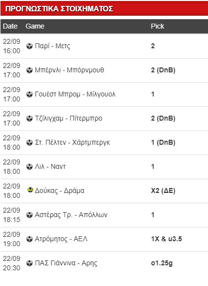 ΥΓ.2: Πρεμιέρα στην Α1 χάντμπολ με ΠΑΟΚ και Φίλιππο να επικρατούν των Διομήδη και ΧΑΝΘ αντίστοιχα, αλλά οι άσσοι δεν αξίζουν το ποντάρισμα και τόσο νωρίς δεν μπορεί να γίνει εκτίμηση των χάντικαπ – γκολ. Ομοίως, παρά την αναστάτωση στην Εδεσσα με την αποχώρηση Πηλαλίδη (προπονητή), ο Αερωπός είναι ισχυρότερος, ποιοτικότερος και γηπεδούχος, συνεπώς θα νικήσει τον Φοίβο. Αν αξίζει κάπου μια κόντρα είναι στο ΔΑΪΣ, όπου ο αποδυναμωμένος και λογικά ασυντόνιστος ακόμα Δούκας -με τόσες σημαντικές απώλειες και νέους αντικαταστάτες (υποδεέστερους σε ποιότητα και παραστάσεις)- θα φιλοξενήσει την Δράμα, που παρολίγο να υποβιβαστεί πέρσι, ωστόσο κράτησε και ενίσχυσε περαιτέρω τον κορμό της. Παραδόξως ο άσσος δεν φτάνει ούτε στο 1.10(!), συνεπώς το Χ2 (8.00) είναι value…