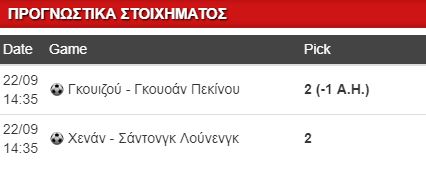 Λιγοστές είναι οι επιλογές από το κουπόνι του Σαββάτου, ωστόσο βγαίνουν σημεία από τ πρωτάθλημα της Κίνας. Αρχικά, η Γκουοάν Πεκίνου έχει ξεκάθαρο προβάδισμα κόντρα στην ουραγό Γκουιζού. Η γηπεδούχος ουσιαστικά έχει υποβιβαστεί και στα τελευταία παιχνίδια δείχνει σημάδια διάλυσης. Η Γκουοάν δεν έχει περιθώρια για νέες απώλειες στη μάχη του τίτλου και το διπλό στο -1 ασιατικό χάντικαπ στο 1.75 είναι αποδεκτό.