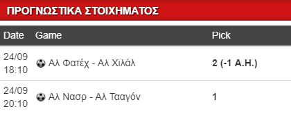 Κλείνοντας, στις 20:10 η Αλ Νασρ υποδέχεται την Αλ Τααγόν. Τη γηπεδούχο τη στήριξα στις δύο πρώτες αγωνιστικές, ενώ την περασμένη βδομάδα κέρδισε εύκολα εκτός την Καντισίγια 3-0 κάνοντας το 3/3 στο φετινό πρωτάθλημα. Οι Μούσα, Τζουλιάνο και Άμραμπατ βρήκαν ρυθμό, ενώ και ο τερματοφύλακας Τζόουνς είναι πολύ καλός. Η φιλοξενούμενη απέσπασε με μαγικό τρόπο 1-1 στην πρεμιέρα από την Αλ Αχλί και την περασμένη βδομάδα συνέτριψε 5-3 την προβληματική ‘Ιτιχαντ. Μέχρι τώρα είναι αήττητη (1-2-0), όμως νομίζω ότι θα σταματήσει σήμερα η ρέντα της.
