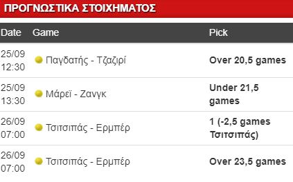 Ο Παγδατής απέναντι στον Τζαζιρί. Δύο ποιοτικοί βετεράνοι, με τον Κύπριο να επιστρέφει μετά το US Open, ενώ ο Τυνήσιος είχε γεμάτη την περασμένη εβδομάδα στην Ταϊπέι. Θεωρώ πως ο Παγδατής θα μπει με μεγάλη διάθεση στο κορτ καθώς του έχει λείψει η δράση. Αν βρει τον συνηθισμένο του ρυθμό στο σερβίς θα βάλει βάσεις νίκης, αλλά επικίνδυνος σε αυτόν τον τομέα είναι και ο αντίπαλός του. Δεν θα έχουμε πολλά μπρέικ και αυτό θα οδηγήσει πιθανότατα σε μεγάλο αριθμό γκέιμ.