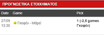 Ο Νταβίν Γκοφέν έχει κατορθώσει να σταθεροποιηθεί στους κορυφαίους 15 τενίστες την τελευταία διετία. Ο Βέλγος αποτελεί σταθερή αξία και μπαίνει στο τουρνουά της Σενζέν με αντίπαλο τον Άντι Μάρεϊ. Ο Σκωτσέζος δεν ενθουσίασε εναντίον του νεαρού Κινέζου, Ζανγκ. 1-1 σετ και 4-2 υπέρ του στο τρίτο όταν αποσύρθηκε ο Ζανγκ. Ο Γκοφέν είναι φαβορί για τη νίκη, καθώς ο Μάρεϊ δεν έχει φτάσει στο επίπεδο που θέλει. Είναι μόλις το 11ο παιχνίδι του μέσα στο έτος και ανακοίνωσε ότι μετά τη Σενζέν θα παίξει μόνο ένα τουρνουά ακόμη και θα σταματήσει για φέτος, ώστε να αφοσιωθεί στην προετοιμασία για το 2019. Είναι μια καλή στιγμή για μια νίκη του Γκοφέν. Ο Βέλγος τον νίκησε πριν 2 χρόνια στην τελευταία τους συνάντηση, ενώ έχει 5 ήττες παλιότερα, όταν ο Μάρεϊ ήταν απλησίαστα ποιοτικός για το επίπεδό του.