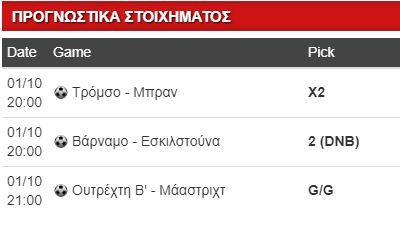 Αρχή εβδομάδας και πρωτομηνιά και δεν χρειάζεται να πιέσουμε πολύ τα πράγματα. Έτσι μεταξύ της αποχής και του ρίσκου να δοκιμάσω κάτι σε μία μέρα δίχως πολλές επιλογές, αποφάσισα να πάω με το 2ο, (όχι που δεν θα το έκανα), αφού θεωρώ πως υπάρχουν κάποια σημεία που αξίζουν ένα μικρό ποντάρισμα. Αρχικά πάω στην Νορβηγία και στο παιχνίδι της Τρόμσο με τη Μπραν. Χτες η Ρόζενμποργκ ηττήθηκε από τη Μόλντε και με νίκη η Μπραν μειώνει στον 1 βαθμό από την κορυφή, ενώ σε μερικές εβδομάδες έχει την Ρόζενμποργκ εντός και έτσι κρατάει ακόμα την τύχη στα χέρια της. Βέβαια προέρχεται από ανέλπιστη ισοπαλία με αντίπαλο την ουραγό Σαντέφιορντ και ίσως αυτό να την έριξε ψυχολογικά. Σε κακή περίοδο και οι γηπεδούχοι με μόλις μία νίκη στα τελευταία 8 παιχνίδια πρωταθλήματος, αν και εντός έδρας είναι πάντα πιο αξιόμαχοι. Ρίσκο στο Χ, πιο ασφαλές το Χ2 στο 1.45.