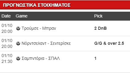 Στο πλαίσιο της 24ης αγωνιστικής της Eliteserien η ομάδα του Νίλσεν αντιμετωπίζει εκτός έδρας την Τρούμσε (έτσι προφέρεται στα Νορβηγικά η Τρόμσο). Σκληρή ομάδα οι γηπεδούχοι, με δυνατή έδρα ανέκαθεν, με στόχο την εξασφάλιση της παραμονής και φέτος. Στο +7 από τη επικίνδυνη ζώνη που δεν της ασκεί μεγάλη πίεση άμεσα. Αντιθέτως, η Μπραν που κυνηγά το «θαύμα» του τίτλου, θέλει πάση θυσία τη νίκη για να πλησιάσει στον πόντο τη Ρόζενμποργκ. Έχει την ποιότητα να φύγει «αλώβητη» από το «Άλφχαϊμ». Διπλό με κάλυψη Dnb.