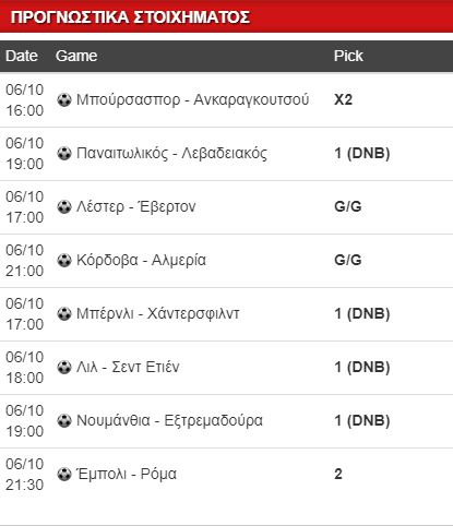 Πρώτο χρονικά παιχνίδι της ημέρας έρχεται από τη γειτονική Τουρκία εκεί όπου η νεανική και με εσωτερικά προβλήματα και δίχως νίκη ακόμα Μπούρσασπορ φιλοξενεί την νεοφώτιστη Ανκαραγκουτσού, που εκπλήσσει θετικά έως τώρα. Οι φιλοξενούμενοι αγωνίζονται με μαχητικότητα σε κάθε παιχνίδι τους, προέρχονται όμως από ήττα και οφείλουν να αντιδράσουν. Το πρώτο τρίποντο ψάχνουν και οι γηπεδούχοι, θεωρώ όμως κάι τέτοιο αρκετά δύσκολο με το Χ2 στο 1.84 να με καλύπτει πλήρως. Στη δυάδα αυτή έβαλα και το ματς της δικιάς μας Σουπερ Λιγκ και πιο συγκεκριμένα επέλεξα το άσο (DNB) στο 1.47 στο παιχνίδι του Παναιτωλικού με τον Λεβαδειακό. Οι γηπεδούχοι προέρχονται από ήττα μετά από 3 αγωνιστικές και με τη δυναμική που βγάζουν στην έδρα τους θα στοχεύσουν στο τρίποντο. Προβληματίζουν οι Βοιωτοί, με 3 εκτός έδρας ήττες φέτος, δίχως ακόμα να σκοράρουν και με αδυναμίες αμυντικά.