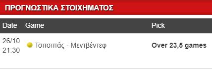 Σούπερ ήταν ο Στέφανος Τσιτσιπάς εναντίον του Πέτερ Γκόγιοβτσικ, επιβλήθηκε με 6/3, 6/1 και θα συνεχίσει με αντίπαλο τον Ντάνι Μεντβέντεφ. Δύο από τα αστέρια της νέας γενιάς, εξαιρετικά φορμαρισμένοι και πρόσφατα τροπαιούχοι! Ο Στέφανος πήρε τον τίτλο στη Στοκχόλμη και ο Ρώσος στο Τόκιο με εκπληκτική εμφάνιση στο 6/2, 6/4 επί του Νισικόρι. Πολύ δύσκολο ματς και για τους δύο, αλλά περιμένω τον Στέφανο να πεισμώσει πολύ γιατί έχει χάσει δύο φορές από τον Μεντβέντεφ. Τον Μάρτιο στο Μαϊάμι 6/2, 4/6, 2/6 και τον Αύγουστο στο US Open με 4/6, 3/6, 6/4, 3/6. Το σετ στο 1,65 – 2,10 αδικεί τον Ρώσο. Αμφότεροι έχουν πρόσφατο ρεκόρ 10-2 και το μόνο σίγουρο είναι ότι θα δούμε ένα θεαματικό ματς! Αν έχετε τρόπο να το παρακολουθήσετε, θα αξίζει 100%. Στοιχηματικά θα κινηθώ συντηρητικά μιας και είναι ντέρμπι. Δεν θα είναι έκπληξη αν κριθεί η νίκη στα τρία σετ, οπότε έχει αξία το ποντάρισμα στα γκέιμ και ειδικά το over 23,5 που μπορεί να προκύψει και σε δύο σετ (π.χ. 7/5, 7/5).