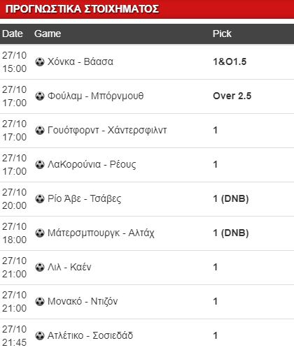 Ξεκίνημα κάνω από το παιχνίδι των 15.00, στην τελευταία αγωνιστική της Α’ Φινλανδίας. Η Χόνκα υποδέχεται την αδιάφορη Βάασα. Εκτός έδρας οι φιλοξενούμενοι είναι αλήθεια πως είναι καλύτεροι από ό,τι εντός, ωστόσο σήμερα δεν έχουν κανένα κίνητρο. Από την άλλη, οι γηπεδούχοι θέλουν καλύτερο αποτέλεσμα από την Κουόπιο που αγωνίζεται εκτός έδρας με την Μαριέχαμν, που παλεύει για να αποφύγει τα μπαράζ. Σε περίπτωση νίκης και των 2 η Χόνκα κερδίζει την 3η θέση αν υπερκαλύψει το -2 στη διαφορά τερμάτων από την αντίπαλό της. Πάμε απλά στο 1&Ο1.5 στο 1.51.