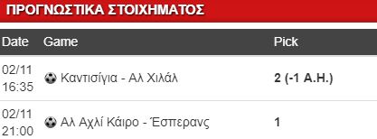 Αρχικά θα κρατήσω τη νίκη της Αλ Αχλί Κάιρο, κόντρα στην Έσπερανς για τον α’ τελικό του Τσάμπιονς Λιγκ Αφρικής. Η γηπεδούχος και πρώτη σε κατακτήσεις στη διοργάνωση με 8 τρόπαια, είναι η μεγαλύτερη ομάδα της Αφρικής. Πέρυσι έφτασε και πάλι στον τελικό, αλλά έχασε από την Γουιντάτ (0-0 εντός, ήττα 1-0 εκτός). Δεν νομίζω να ξανακάνει το ίδιο λάθος η Αλ Αχλί και να μην εκμεταλλευτεί την έδρα της, αφού στον επαναληπτικό την περιμένει πολύ δύσκολο έργο. Ο άσος στο 1.94 είναι αποδεκτός και θα μπει στο παιχνίδι μου.