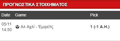 Στις 14:50 η Αλ Αχλί θα υποδεχθεί την Έμιρεϊτς για το πρωτάθλημα των ΗΑΕ. Η γηπεδούχος είναι σε σταθερά ανοδική πορεία μετά την πρόσληψη του Ροδόλφο Αρουαμπαρένα. Το σερί των τριών νικών μπορεί να σταμάτησε την Πέμπτη, ωστόσο το 2-2 με την Ουάχντα μόνο άσχημο δεν ήταν. Αν κερδίσει θα βρεθεί στο -3 από την κορυφή και δεν νομίζω να αφήσει την ευκαιρία να πάει χαμένη. Οι Αγιόβι, Ντίαζ, Βέκιο και Λουβαδόρ τα πηγαίνουν καλά στο επιθετικό κομμάτι. Τη φιλοξενούμενη την κόντραρα την περασμένη βδομάδα, αλλά πήρε με μαγικό τρόπο την ισοπαλία 3-3 από την Αλ Νασρ. Δεν νομίζω να έχει ξανά την τύχη με το μέρος της και θα πάω με τον άσο στο -1 ασιατικό χάντικαπ στο 2.00.