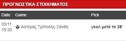 Στην ελληνική Super League σήμερα ο Αστέρας Τρίπολης υποδέχεται την Ξάνθη, μονόδρομος η νίκη για τους Αρκάδες, αν πάρουν το τρίποντο βγαίνουν από την επικίνδυνη ζώνη. Δεν θα είναι εύκολο απέναντι σε μια Ξάνθη που είναι αήττητη εκτός έδρας και διαθέτει μία από τις καλύτερες άμυνες του πρωταθλήματος. Εκεί θα στηριχθούμε ευελπιστώντας ότι δεν ανοίξει το σκορ πριν το 28’. Γκολ μετά το 28’ έχει απόδοση 2.05, αξίζει και με το παραπάνω, μόνο που θα πρέπει για κάτι λιγότερο από ένα ημίωρο να ζει όποιος το επιλέξει με το άγχος …του γρήγορου γκολ.