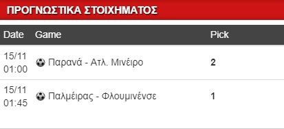 Στην τελευταίες «στροφές» το πρωτάθλημα της Λατινικής Αμερικής με αρκετές αμφίρροπες αναμετρήσεις να διεξάγονται από χτες, με το κύριο μενού να είναι προγραμματισμένο για σήμερα και αύριο. Λόγω της διαφοράς στην ώρα τα 2 παιχνίδια που κράτησα διεξάγονται ξημερώματα προς Πέμπτη. Μία ώρα μετά τις δώδεκα η Ατλ. Μινέιρο δοκιμάζεται στην έδρα της Παρανά. Οι γηπεδούχοι είναι ουραγοί, είναι ήδη υποβιβασμένοι και μαθηματικά, ωστόσο προέρχονται από το πρώτο φετινό τους διπλό, αφού με γκολ στο 90’ επικράτησε της προτελευταίας Αμέρικα Μινέιρο. Βέβαια τα πράγματα είναι σαφώς πιο δύσκολα σήμερα κόντρα στην Ατλ. Μινέιρο, που στοχεύει στην εξάδα και στο Κόπα Λιμπερταδόρες. Τέσσερις ομάδες αγωνίζονται για το τελευταίο εισιτήριο με την Μινέιρο να υπερτερεί αυτή τη στιγμή μόλις για έναν βαθμό. Τα διπλό σήμερα είναι κάτι παραπάνω από αναγκαίο και αν οι φιλοξενούμενοι αγωνιστούν όπως κόντρα στην Παλμέιρας την προηγούμενη αγωνιστική δεν θα έχουν πρόβλημα να φύγουν με τους 3 βαθμούς της νίκης. Διπλό στο 1.50.