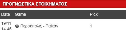 Θα αποφύγω να πάρω τον άσο στο -1 ασιατικό χάντικαπ, αφού πιστεύω ότι η Περσέπολις θα αρκεστεί και στη νίκη με ένα γκολ διαφορά. Καλή τύχη στις επιλογές σας.