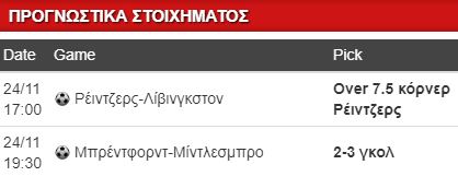 Επιστροφή στη Βρετανία ξεκινώντας από τη Σκωτία και την αναμέτρηση Ρέιντζερς-Λίβινγκστον. Οι «Τζερς» θέλουν να κρατηθούν στο -2 από τη Σέλτικ και να πάρουν ρεβάνς για την ήττα τους με 1-0 από τη Λίβι. Aναμένεται πίεση απέναντι σε μια σκληρή ομάδα που ξέρει να ταμπουρώνεται. Η πίεση φέρνει πολλά κόρνερ στο «Άιμπροξ» για τους γηπεδούχους, τα 8 είναι εφικτά για τους «Τζερς» με το Over 7.5 κόρνερ στο 1.83.