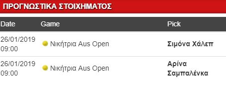 Σιμόνα Χάλεπ: Δικαιολογημένα στα φαβορί (μαζί με την Σ. Ουίλιαμς), λόγω ποιότητας και σταθερότητας. Είναι το Νο 1 του αθλήματος αυτή τη στιγμή. Πολύ σημαντικό ότι ξεκουράστηκε αρκετά, το είχε ανάγκη. Όταν παίζει διαδοχικά και υπό πίεση μπορεί να χάσει το μυαλό της και προκύπτουν ήττες, αλλά σε ξεκίνημα σεζόν με την ενέργεια στο 100% έχει καλές πιθανότητες να πάει ως το τέλος.