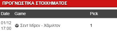 Στη Σκωτία θα στραφούμε σήμερα και πιο συγκεκριμένα στη μάχη της Σεντ Μίρεν με τη Χάμιλτον, στην έδρα της πρώτης. Η Σεντ Μίρεν πραγματοποίησε τη μεγαλύτερη έκπληξη της αγωνιστικής την περασμένη εβδομάδα, αφού βρήκε μπόσικη τη Χαρτς και επικράτησε με 2-0 εντός έδρας, παίρνοντας ένα τεράστιο τρίποντο, τόσο για βαθμολογικούς, όσο και για ψυχολογικούς λόγους. Ήταν μόλις η δεύτερη νίκη της στη φετινή σεζόν, μετά από εκείνη της πρεμιέρας.