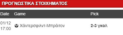 Μένουμε στην Πρέμιερ Λιγκ της Αγγλίας για τον αγώνα Χάντερσφιλντ-Μπράιτον. Τρία ματς χωρίς ήττα για τους γηπεδούχους, που έρχονται από μεγάλο διπλό επί της Γουλβς, βγήκαν από την επικίνδυνη ζώνη, όπλο τους φυσικά η συμπαγής άμυνα. Βίοι αντίθετοι, αλλά πιο …άνετοι για τη Μπράιτον, που κέρδισε όλα τα ματς που έδωσε τον Οκτώβριο (με 1-0), μετρά όμως τώρα ένα μήνα χωρίς νίκη και δείχνει τελευταία ευάλωτη στην άμυνα.
