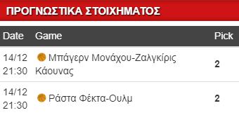 Στο Μόναχο, η Μπάγερν υποδέχεται τη Ζαλγκίρις Κάουνας, με τους μπουκ να χρίζουν τους Γερμανούς φαβορί της αναμέτρησης, επηρεασμένοι από τις απουσίες των Λιθουανών. Ο Σαρούνας Γιασικεβίτσιους δεν θα έχει κατά πάσα πιθανότητα στη διάθεσή του τους Νέιτ Ουότερς, Αντάνας Καβαλιάουσκας και Άαρον Ουάιτ, αλλά είναι πιθανό να επιστρέψει ο αρχηγός Παούλιους Γιανκούνας. Η Ζαλγκίρις τα καταφέρνει φέτος καλύτερα μακριά από την έδρα της, καθώς έχει χάσει μόνο από την ΤΣΣΚΑ Μόσχας στην παράταση. Ο Σάρας έχει φτιάξει και φέτος μια πολύ καλή ομάδα, που μπορεί να λειτουργήσει ομαλά ακόμα και όταν έχει απουσίες και έτσι, το 2.30 στο «διπλό» δεν μπορεί να αγνοηθεί! Σημαντική απουσία, εξάλλου, θα έχει και η Μπάγερν, η οποία θα παίξει χωρίς τον βασικό ψηλό της Ντέβιν Μπούκερ.