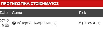 Η Λόκερεν που βρίσκεται στην τελευταία θέση της κατάταξης, φιλοξενεί την Κλαμπ Μπριζ. Με την εικόνα που έχει παρουσιάσει η ομάδα του Ιβάν Λέκο στα τελευταία παιχνίδια μακριά από το γήπεδό της, δίνει ελπίδες στους «Τρικολόρ» ώστε να αποσπάσουν θετικό αποτέλεσμα. Πρόσφατα άλλωστε, έχουν πάρει δύο σημαντικές νίκες, κόντρα σε Έουπεν και Σιντ Τρούιντεν.