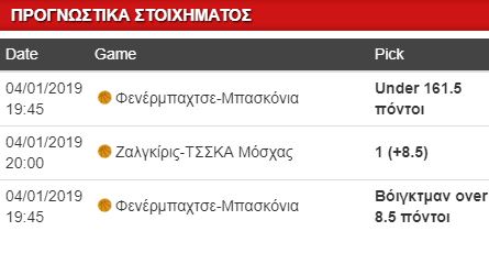 Αρχίζουμε από τον αγώνα της Φενέρμπαχτσε με την Μπασκόνια, όπου οι πρωτοπόροι υποδέχονται τους λαβωμένους Βάσκους. Ο Περάσοβιτς δεν θα έχει στη διάθεσή του τους Σενγκέλια, Γκρέιντζερ, Γκαρίνο και Σεντερέσκις, οπότε η μόνη του ελπίδα για να κυνηγήσει το ματς είναι να παίξει άμυνα. Το line των 161.5 πόντων είναι υψηλό και θα το κρατήσουμε στις επιλογές μας, ενώ αξία έχει και το over 8.5 πόντοι του Βόιγκτμαν, ο οποίος θα πάρει περισσότερο χρόνο λόγω της σημαντικής απουσίας του Σενγκέλια.