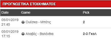 Δεύτερη επιλογή προκύπτει από το ματς της Αλαβές ενάντια στη Βαλένθια. Εξαιρετική πορεία φέτος για τους Βάσκους, όμως έκλεισαν το ’18 με μία μόλις νίκη σε πέντε αγωνιστικές. Αντιθέτως, οι «Νυχτερίδες» νίκησαν την Ουέσκα στο τελευταίο και έκαναν δεύτερη νίκη σε πέντε αγωνιστικές, ενώ διατηρούν αήττητο για τρία ματς. Προμηνύεται «μάχη» με κλειστό παιχνίδι, ο νικητής (αν υπάρξει) θα βγει στις λεπτομέρειες. Η παράδοση τελευταία, δίνει μικρό προβάδισμα στη Βαλένθια, ωστόσο πρέπει να «σπάσει» το αήττητο της Αλαβές στο «Μεντιθορόθα». Δύσκολο εγχείρημα!Κρατάμε το εύρος τερμάτων «2-3».