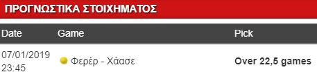 Οι μπουκ θεωρούν τον Φερέρ φαβορί (1.80 – 2.10), στηρίζονται στο γεγονός ότι πιθανώς το θέλει περισσότερο. Ότι θέλει να παίξει ένα ματς ακόμα, ότι δεν φοβάται να ρισκάρει τραυματισμό καθώς δεν θα είναι στο Αυστραλιανό, όμως ο Χάασε είναι σοβαρός αντίπαλος. Έχει 2/2 με τον Ισπανό και δεν έχει να φοβηθεί τίποτα απέναντί του. Γι’ αυτό και προτιμώ το ποντάρισμα στα γκέιμ.