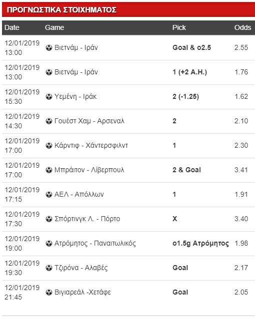ΑΓΓΛΙΑ: Στήριγμά μου για σήμερα η Αρσεναλ. Εχει επιστροφές στην άμυνα δίπλα στον Σωκράτη, που ισορροπούν τη λειτουργία της και βρίσκει ιδανικό αντίπαλο για ματς ρυθμού και κόντρας, στην οποία είναι σαφώς καλύτερη! Επιλογή και ο άσος της Κάρντιφ σε τέτοια μεγάλη απόδοση στο ντέρμπι των μελλοθάνατων, ενώ στο Μπράιτον αναμένω αντίδραση της Λίβερπουλ μετά το ζευγάρι ηττών. Τσέλσι και Τότεναμ πέρασαν από ‘κει με 2-1…