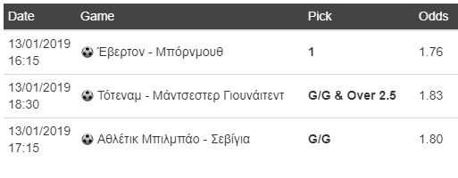 Δεύτερη επιλογή από Αγγλία επίσης, με το ντέρμπι ανάμεσα στην Τότεναμ και τη Μάντσεστερ Γιουνάιτεντ. Σε πολύ καλή κατάσταση και οι δύο ομάδες, τα νέα δεδομένα είναι στις τάξεις των «Κόκκινων» αφού η έλευση του Σούλσιερ στον πάγκο, έφερε αισιοδοξία και μια επιθετική «αύρα» στην ομάδα, που πετυχαίνει πιο εύκολα γκολ και προσφέρει περισσότερο θέαμα. Η Τότεναμ έκανε μια απρόσμενη «γκέλα» εντός έδρας με τη Γουλβς, όμως επέστρεψε στις νίκες και μετρά τέσσερις στα τελευταία πέντε ματς. Δύσκολα θα μείνουν στο μηδέν, ως εκ τούτου με βάση το αμφίσκορο, επιλέγω το combo g/g & over 2.5.