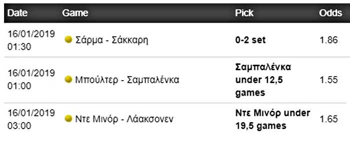 Η περιπέτεια της Σάρμα στο ΑΟ λογικά θα τελειώσει κάπου εδώ και μακάρι να γίνει αυτό στα δύο σετ. Από εκεί και πέρα μια δυάδα μπορεί να προκύψει από το Σαμπαλένκα – Μπούλτερ. Η Λευκορωσίδα είναι υπερόπλο και έχει την ικανότητα να τελειώσει το ματς παίρνοντας μάξιμουμ 12 γκέιμ. Υπερτερεί σε ποιότητα, ενέργεια, ένταση και με λίγη τύχη όλα θα πάνε καλά! Στην ίδια λογική και το νέο αστέρι του Αυστραλιανού τένις, ο Ντε Μινόρ εναντίον του Λάακσονεν. Περιμένω τρία σετ αλλά το under 19,5 του Ντε Μινόρ μας δίνει κάλυψη σε περίπτωση που ένα απ’ αυτά πάει σε 7ο γκέιμ (υπέρ του).