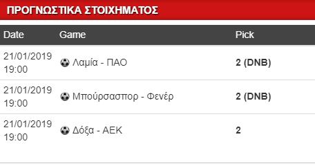 Τέλος και πάλι στην 19.00 η ΑΕΚ Λάρνακας δοκιμάζεται στην έδρα της Δόξας. Οι γηπεδούχοι προέρχονται από νίκη, έχουν στόχο την παραμονή τους την οποία δείχνουν πως εύκολα ή δύσκολα θα την πετύχουν και φέτος. Με τους «μεγάλους» η Δόξα παρουσιάζεται συχνά αρκετά soft, ενώ σήμερα δεν θα έχει και τον πρώτο της σκόρερ Σαντίκ (12/12) που ζήτησε να πάει στην Ταραγόνα. Δίχως τους 2 βασικούς της επιθετικούς και η ΑΕΚ, που συμπλήρωσε 8 αγωνιστικές δίχως νίκη και βλέπει την 4άδα να απομακρύνεται. Με νέο τεχνικό σήμερα, τον Βάσκο Ιδιάκεθ, ο οποίος το καλοκαίρι έφυγε από την ομάδα μετά από 2 σερί χρόνια για να δοκιμαστεί στη Segunda και τη Σαραγόσα, στην οποία απολύθηκε σύντομα. Γνωρίζει την ομάδα και σήμερα μπορεί να πάρει το πολύτιμο διπλό, έστω και οριακά. Μάλιστα η ομάδα της Λάρνακας προέρχεται από εκτός έδρας νίκη μεσοβδόμαδα με αντίπαλο την Σαλαμίνα με 1-2 και μάλιστα με ανατροπή, στο πρώτο μεταξύ τους ματς για τους «16» του κυπέλλου. Διπλό στο 2.25.